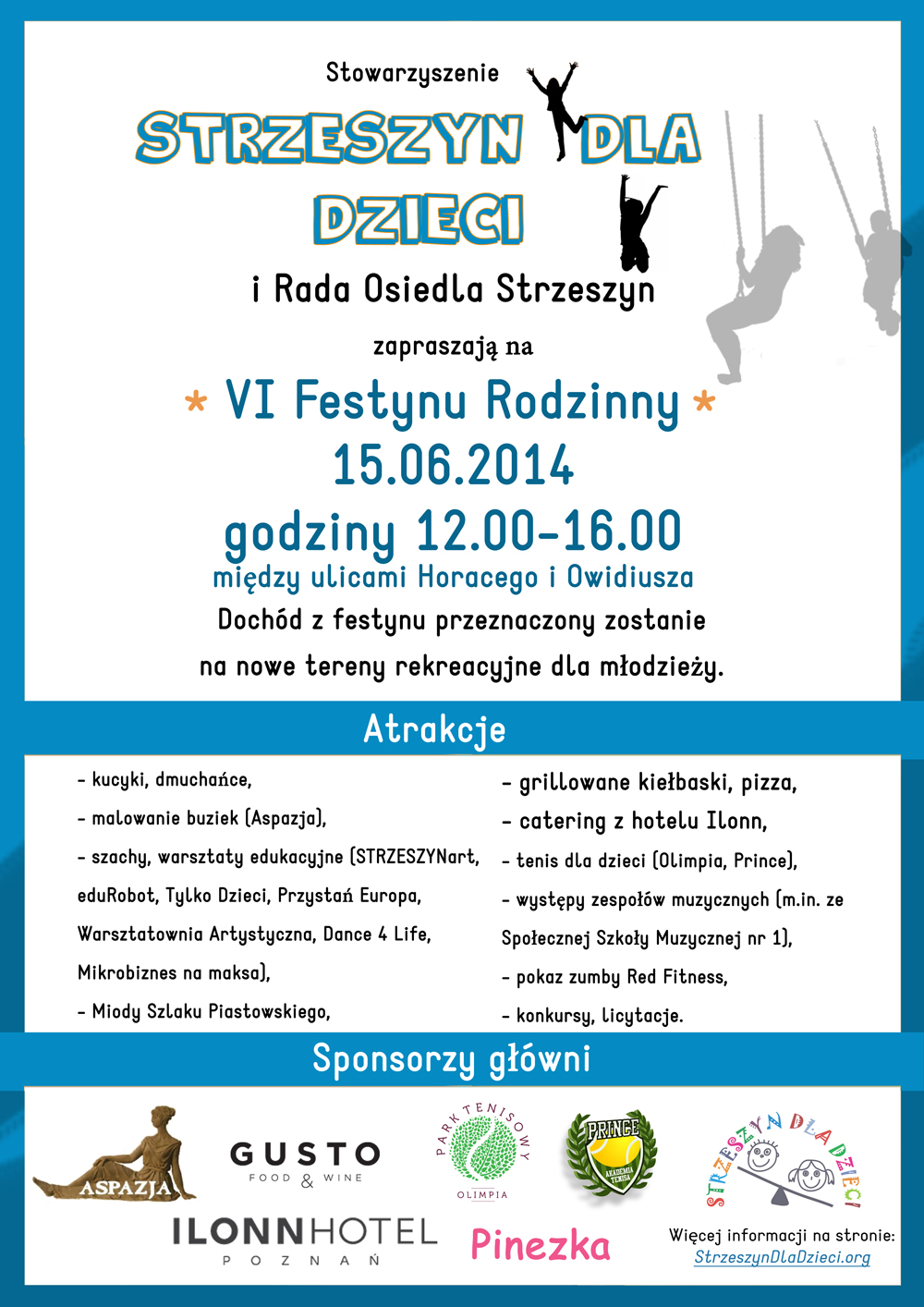 Serdecznie zapraszamy na VI Festyn Rodzinny, który odbędzie się 15 czerwca w godzinach od 12 do 16. Spotykamy się tradycyjnie już na placu pomiędzy ulicami Owidiusza i Horacego. W tym roku z pomocą lokalnych firm i mieszkańców osiedla przygotowaliśmy wiele atrakcji dla rodzin i dzieci.
